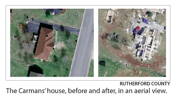 Following the storm’s howl was a peaceful silence. Carman opened his eyes to see a mass of fluffy cotton candy-colored insulation covering the floor. The trey ceiling in his bedroom collapsed on top of the bed where he had been sleeping minutes earlier. The kitchen window was blown away, the roof over the garage collapsed and his favorite recliner in the living room was crushed by debris.